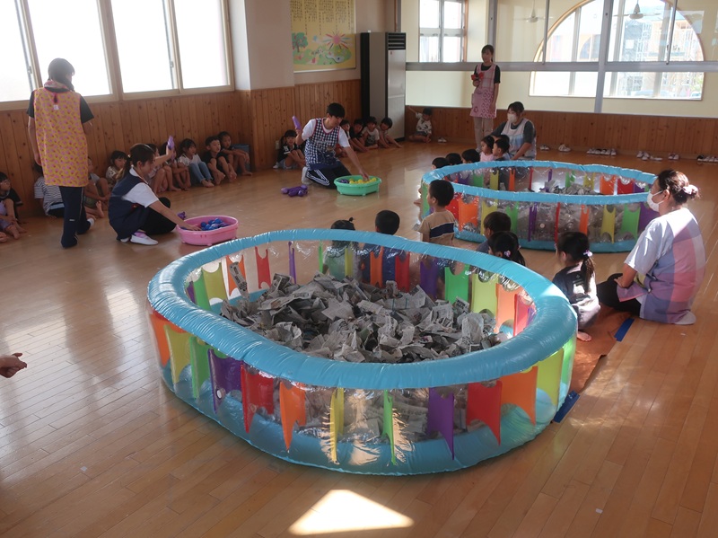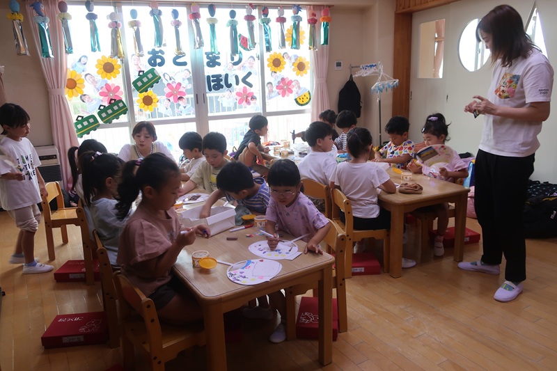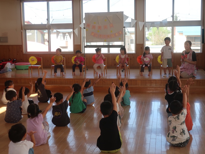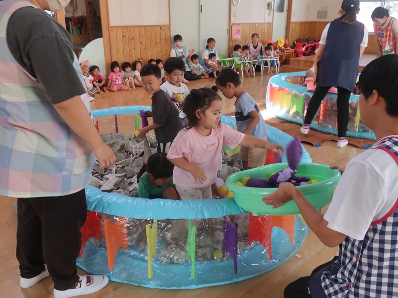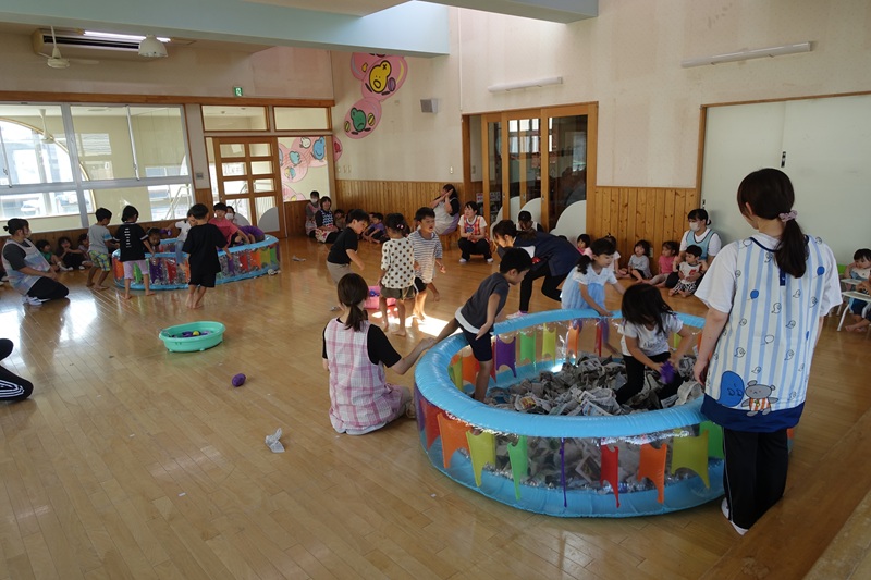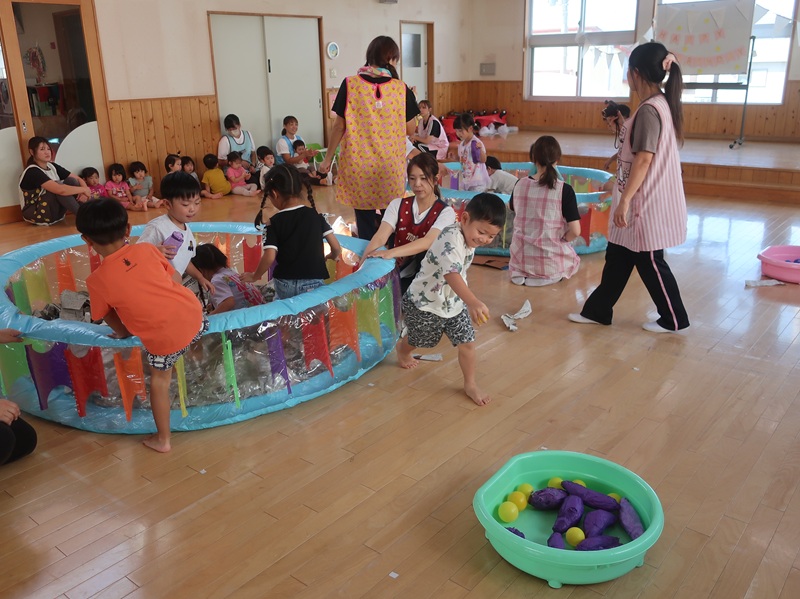 子どもたちが楽しみにしていたお祭り。みんなで盆踊りをし、大抽選会、弘大大道芸サークルMochaさんの出し物を楽しみました。その後には、各お店のコーナーをまわり、にぎわいました。くじやわなげ、ヨーヨーなどの遊びのコーナー、やきそばやからあげ、アイスなどの食べ物のコーナーなど、たくさんのコーナーが並び、家族や先生、お友達と一緒に思い出のひと時を過ごすことができました♪♪今回は弘大生のお兄さん、お姉さんにバルーンアートコーナーも開いていただくことができ、子どもたちの目を輝かせてくれました★☆