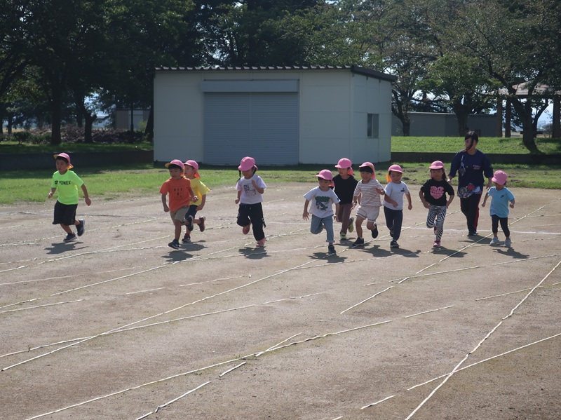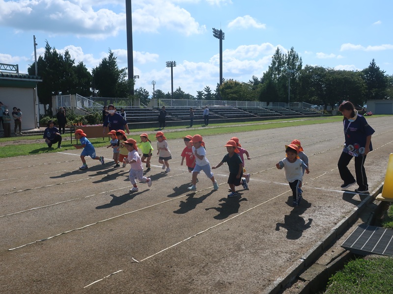 晴天の下、無事に今日は、年少・年中・年長さんが、浪岡総合公園内の陸上競技場にてマラソン大会を行うことができました。