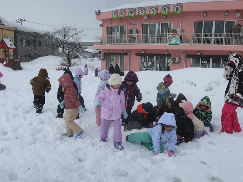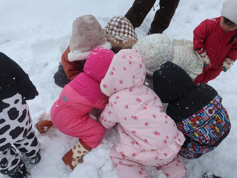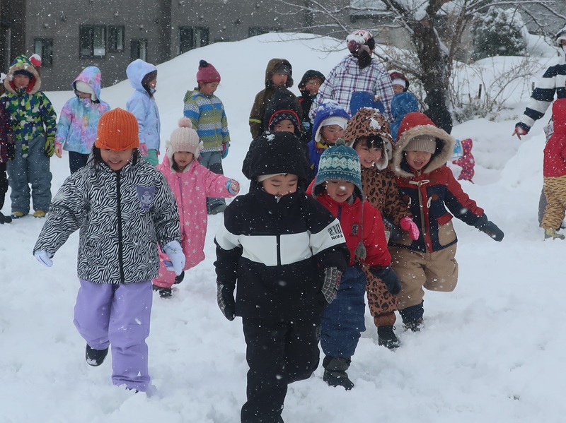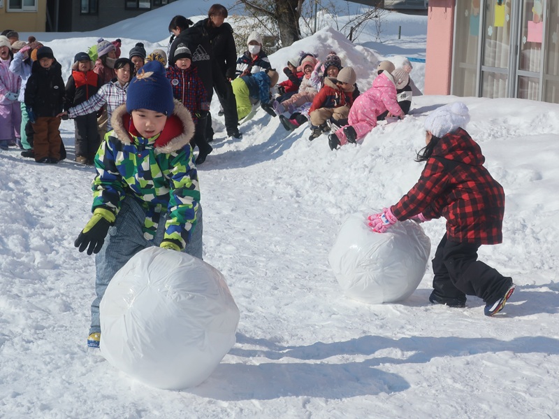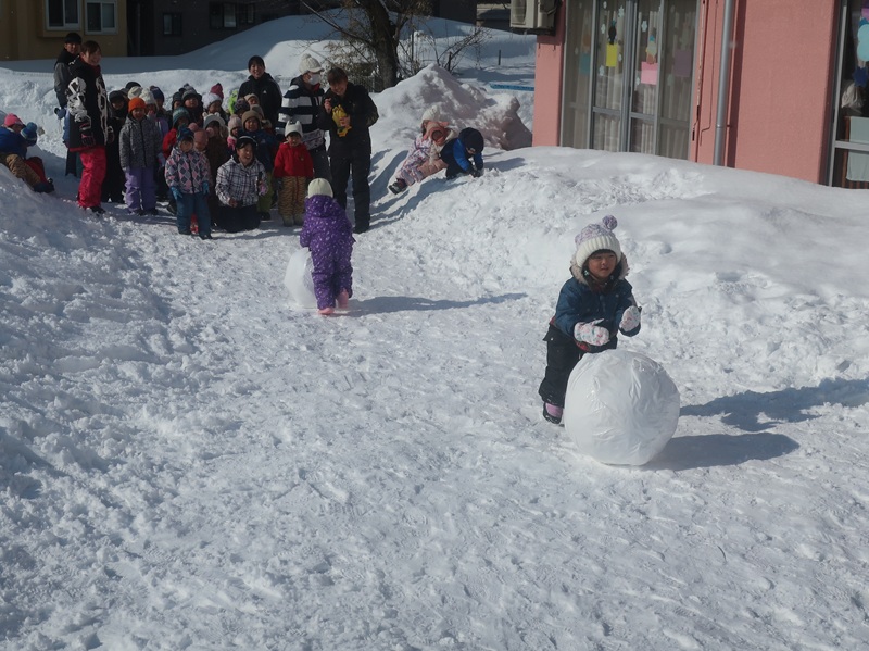 今回は、優しい赤い鬼さんと緑の鬼さんに登場していただき、子どもたちと一緒に「おにのパンツ」を歌ったりして少し場が和んだ後に、豆まきのイベントを始めました。本当は怖くない鬼さんだけどもやっぱり風貌が怖いので、子どもたちは足をすくませながら鬼と向き合いました。小さいお友達は泣いて怖がる子がほとんどでしたが、3歳以上児さんになると、逃げながらも勇敢に豆(に見立てた新聞紙)を投げる子も見られ、成長を感じさせていました。
