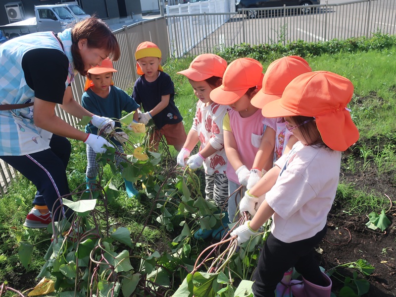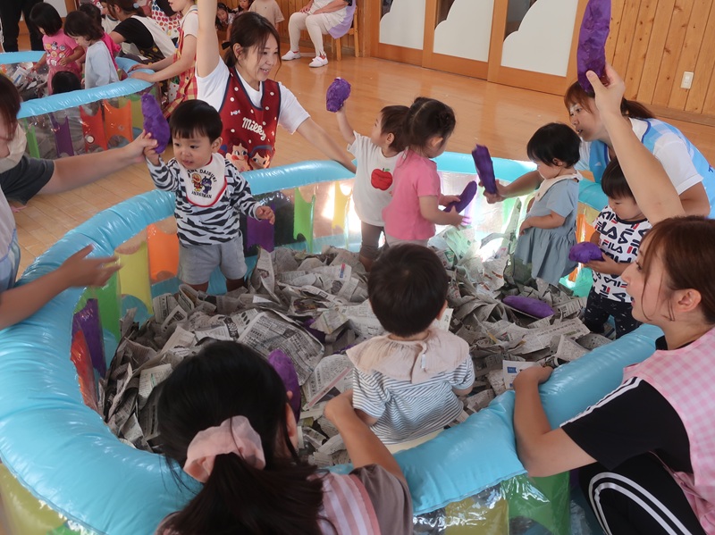 桃太郎のお話のエプロンシアターや、「ぞうくんのさんぽ」の大型絵本、その他紙芝居やさまざまな絵本の紹介などを楽しみました。知ってる野菜の絵を見つけて名前を呼んだり、イカととタコの足の数を数えてみたり、新たな発見をして指差ししたり、裏表紙のオチで笑ったり、飛び出す絵本に驚いたりと、いろいろな感動を味わうことができた子どもたちです。