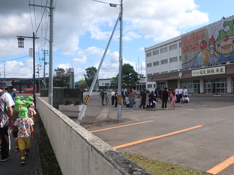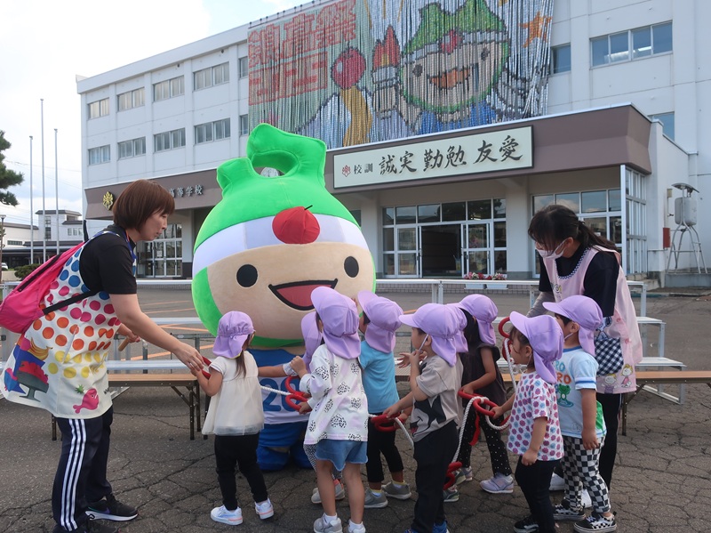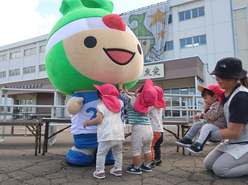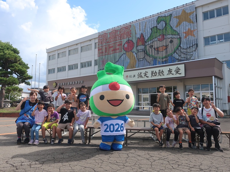 その壁画を前に、年長さんが浪岡高校の生徒さんとアップリート君と一緒に集合写真撮影に加わりました。
