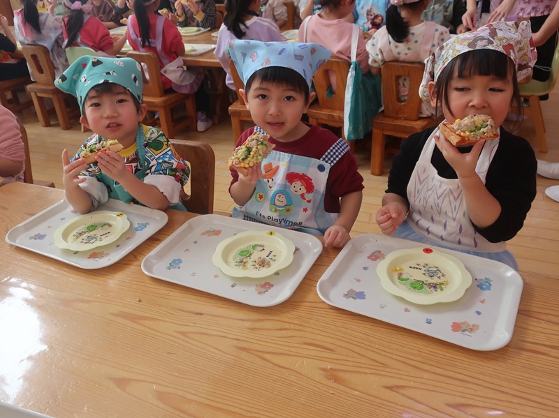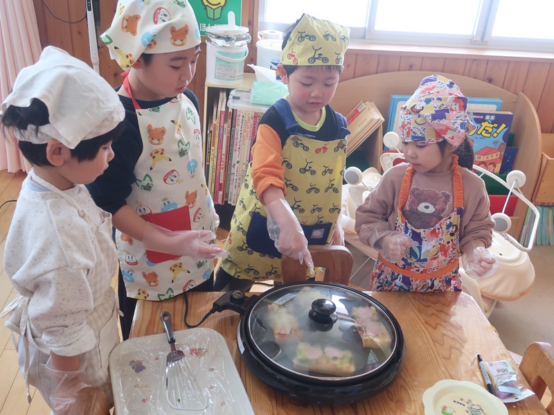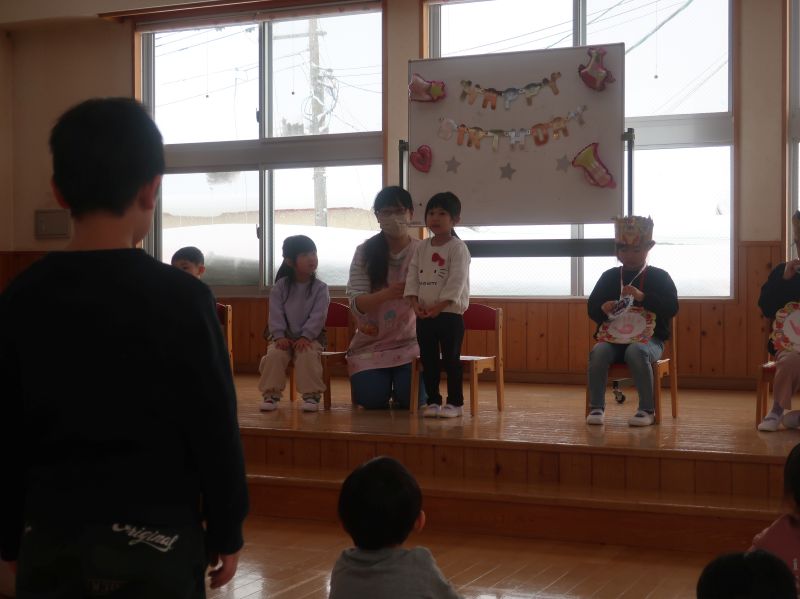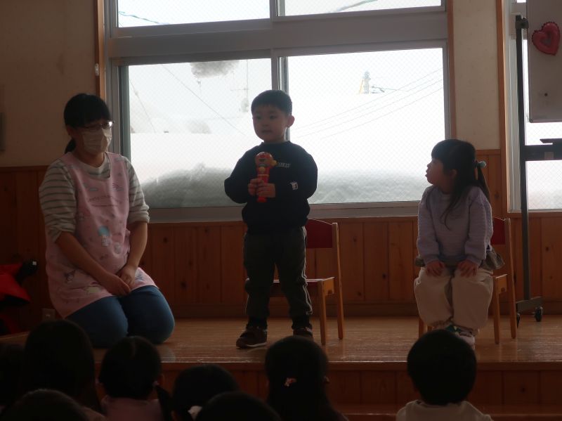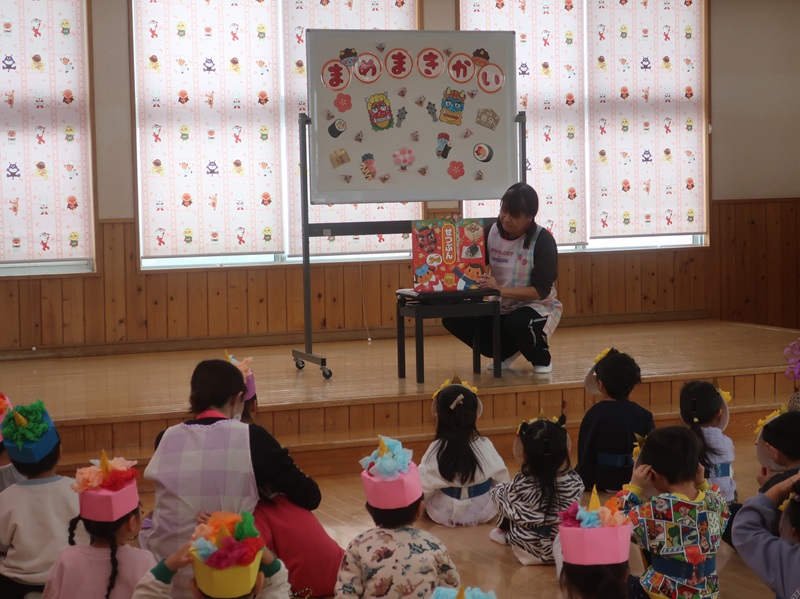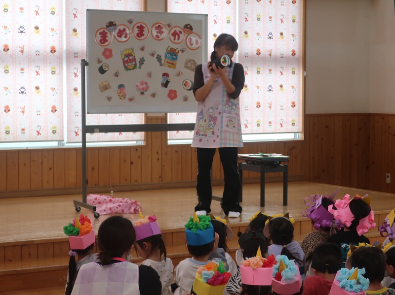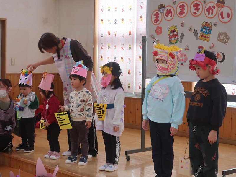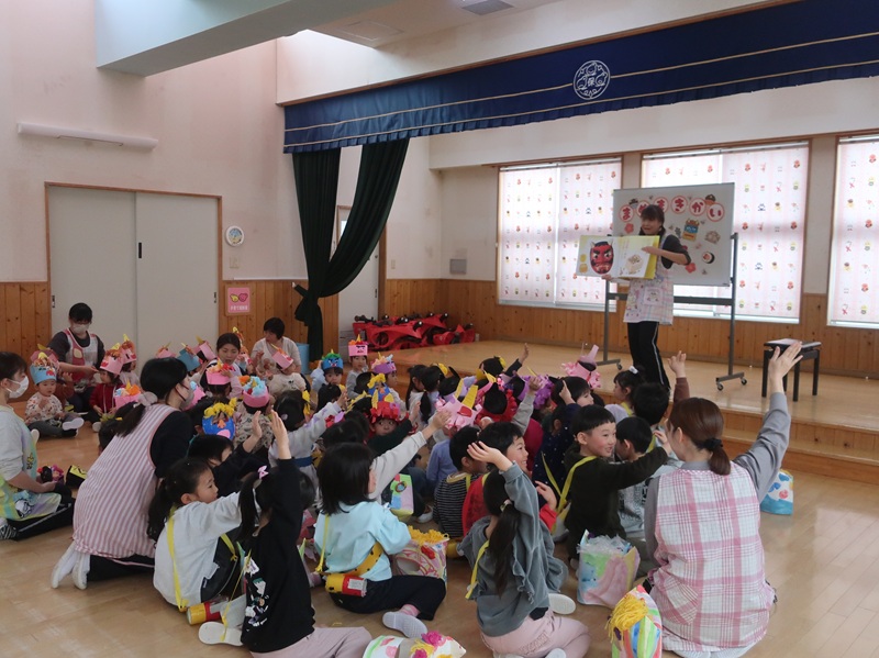 鬼を退治し、福を招き入れるイベント。集会では、節分は何かについてのお話や、心の中の悪い鬼は何かな?と問いかけたりして、みんなで考える場面がありました。
