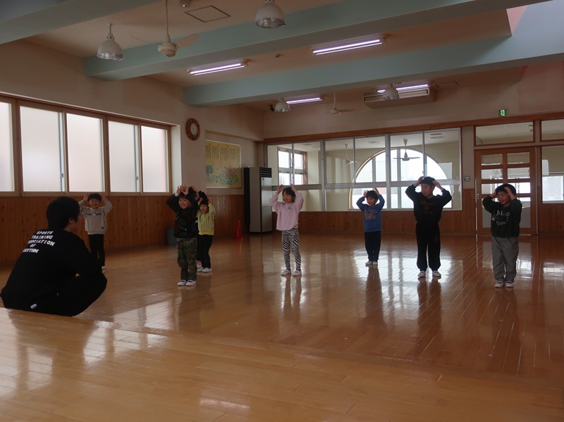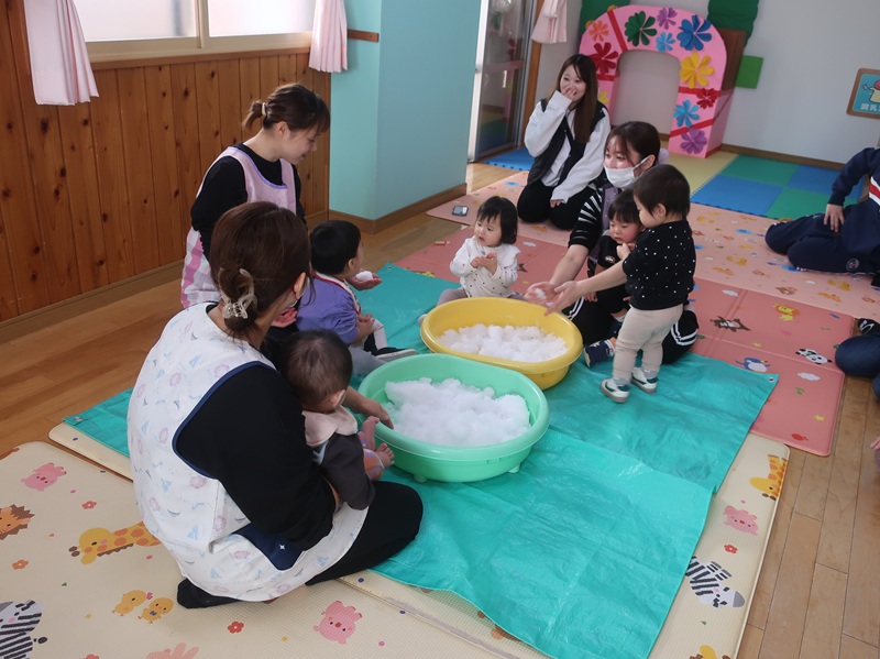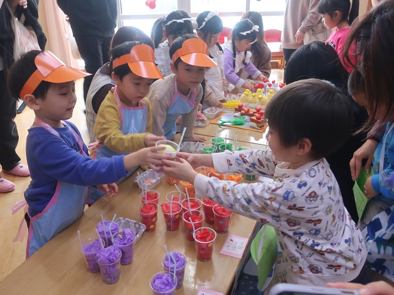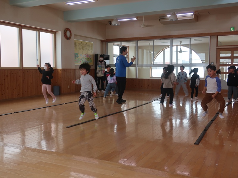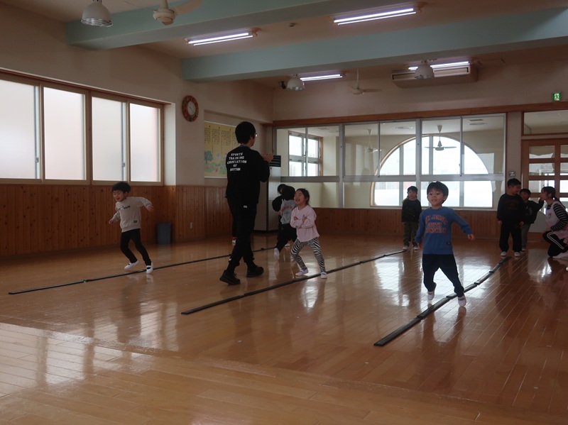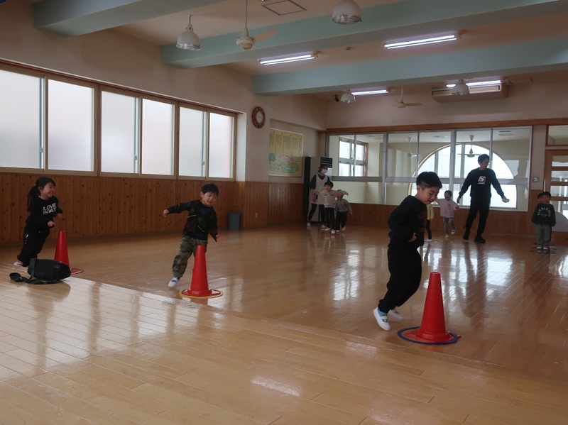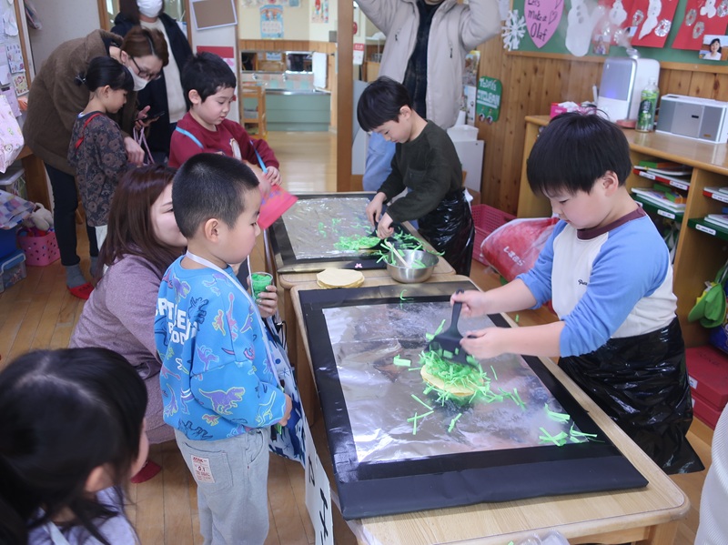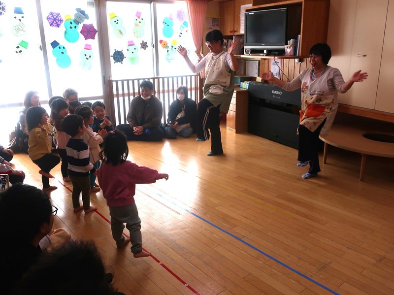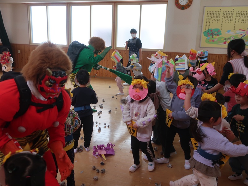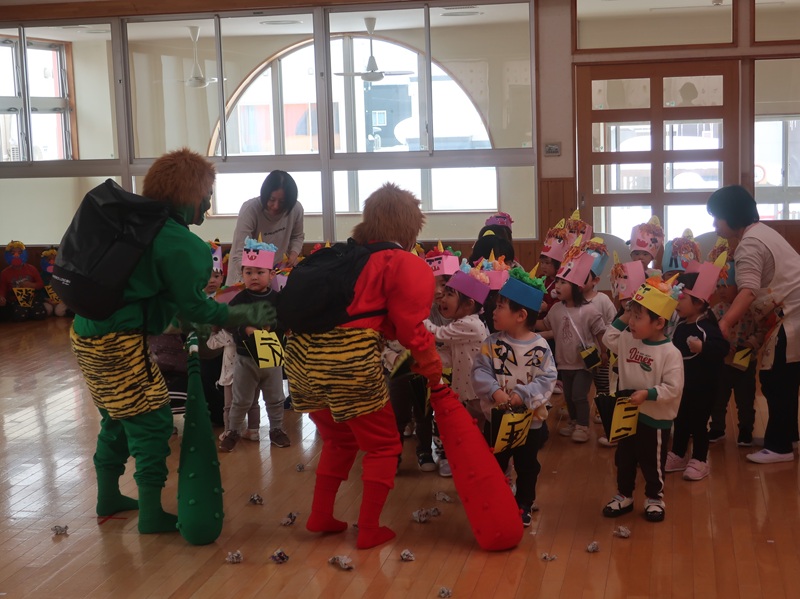 今回は、優しい赤い鬼さんと緑の鬼さんに登場していただき、子どもたちと一緒に「おにのパンツ」を歌ったりして少し場が和んだ後に、豆まきのイベントを始めました。本当は怖くない鬼さんだけどもやっぱり風貌が怖いので、子どもたちは足をすくませながら鬼と向き合いました。小さいお友達は泣いて怖がる子がほとんどでしたが、3歳以上児さんになると、逃げながらも勇敢に豆(に見立てた新聞紙)を投げる子も見られ、成長を感じさせていました。